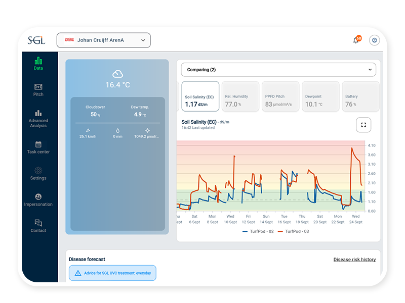 TurfBase is the ultimate data management dashboard for the groundskeeper. The live data module, included in your TurfPod subscription allows you to view, analyse, and compare key metrics across different pitch areas with interactive charts. Effortlessly switch between multiple pitches and track performance against your target values, all in one place.